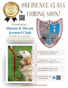 We recently added non-slip rubber flooring to the building, and we also have a large outdoor area totally fenced in for training. You’re invited to come and visit this wonderful facility at the Washington County Agricultural Education Center 7313 Sharpsburg Pike, Boonsboro, MD