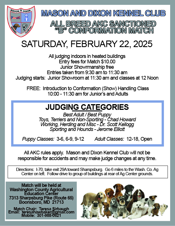 MDKC Sanctioned Match 9:30 am – 3:00 pmFebruary 22, 2025 Washington County Agricultural Education Center7313 Sharpsburg PikeBoonsboro, MD 21713USAView LocationMap Washington County Agricultural Education Center iCal Google Calendar View full calendar